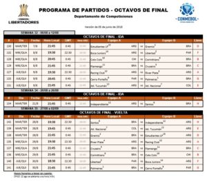 A menos de 9 dias para el inicio del mundial CONMEBOL hizo oficial los cruces por octavos de final de la copa. Atletico jugará con Atlético Nacional el 9/08 a las 21.45 hs. y la vuelta será el 28/08 a las 21.45 hs.