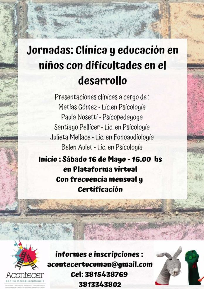 ACONTECER – Centro Interdisciplinario, invita a participar e inscribirse a las Jornadas «CLÍNICA Y EDUCACIÓN EN NIÑOS CON PROBLEMÁTICAS GRAVES EN EL DESARROLLO», lanzando así este nuevo espacio que llevará adelante sostenido con profesionales de la Institución, quienes cuentan con amplia trayectoria en el campo de tratamientos y atención en problemáticas relacionadas a la infancia.