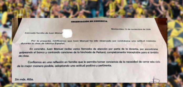 Pero lo que generó gran repercusión entre los usuarios fue el motivo por el que el niño fue apercibido. Según la nota, se encontraba «golpeando el banco y cantando canciones de la hinchada de Peñarol».